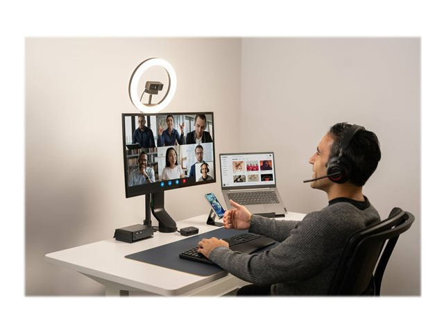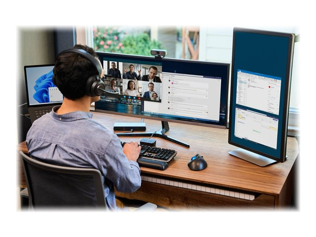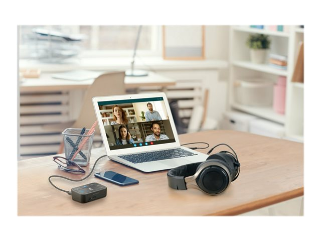 Les professionnels travaillant au bureau, à domicile ou en déplacement ont fréquemment besoin de passer d'une source audio à une autre depuis leur ordinateur portable, leur téléphone ou d'autres appareils. Qu'il s'agisse de répondre à un appel vidéo, de passer un appel téléphonique ou d'écouter de la musique, le basculement entre différents appareils peut être long et complexe. Notre switch audio 3 en 1 permet aux professionnels d'utiliser un même casque filaire ou sans fil tout en basculant entre trois sources audio différentes. Les utilisateurs peuvent facilement basculer entre leur ordinateur portable, leur téléphone ou leur tablette, ce qui leur permet d'augmenter leur productivité. Compatible avec de nombreuses plateformes, telles que Microsoft Teams, Google Meet, Zoom et WebEx, le switch audio 3 en 1 professionnel pour casques offre une expérience audio professionnelle grâce à ses boutons de commande pratiques permettant la commutation des appareils, le contrôle du volume et la désactivation du son.
