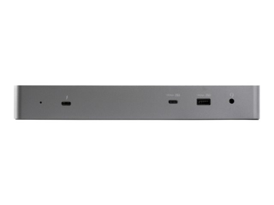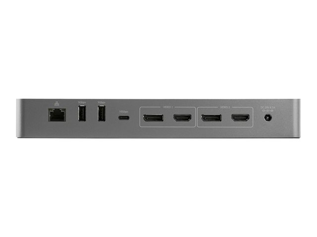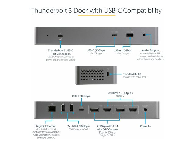 Une station d'accueil Thunderbolt 3 certifiée haute performance avec compatibilité USB Type-C offrant une prise en charge de la vidéo DSC 4K 60 Hz à double moniteur via des sorties vidéo Dual ou dual HDMI 2.0, une alimentation de 96 W avec une puissance maximale de 100 W, un concentrateur USB 3.2 avec 5 ports USB et 2 ports de charge rapide BC 1.2, un port Ethernet gigabit et des ports pour casque.