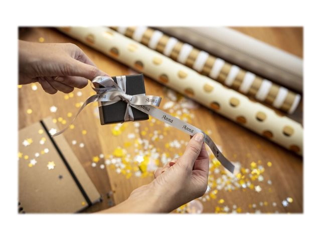 Lors d'occasions spéciales, utilisez le ruban TZe-R931 avec votre étiqueteuse P-touch pour adresser vos vœux aux personnes qui vous sont chères.  Laissez libre cours à vos talents et personnalisez vos cadeaux, vos cartes et vos créations avec le ruban tissu TZe-R931 Brother original.