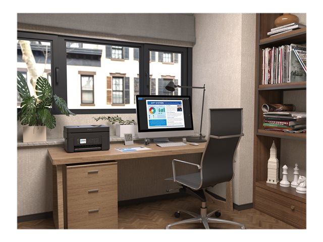Cette imprimante jet d'encre multifonction élégante, compacte et facile d'utilisation peut réduire le gaspillage et les coûts avec l'impression recto verso A4 et des cartouches d'encre séparées économiques. Grâce au chargeur automatique de documents, la technologie Scan-To-Cloud et le grand écran LCD de 6,1 cm, vous pouvez numériser, copier ou faxer plusieurs pages d'affilé de manière rapide et simple. L'impression en déplacement est aisée grâce au Wi-Fi, Wi-Fi Direct, Epson Connect et Apple AirPrint .